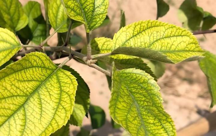 缺铁病为害症状:一般嫩梢先表现症状,叶片变薄黄化,呈现淡绿至黄白色,叶脉保持绿色,在黄化叶片上形成明显的绿色网纹,小枝顶端的叶片尤为显著。病株枝条纤弱,幼枝上的叶片极易脱落,仅存稀疏的叶片。小枝叶片脱落后,下部较大的枝条才会长出正常的枝叶,但顶枝会陆续死亡。发病严重时,全株叶片均变为橙黄色。