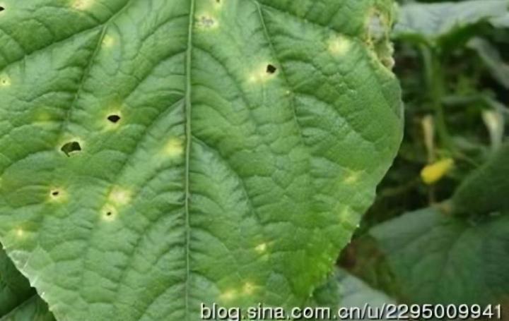 黄瓜全生育期均可发生病害,主要危害生长点、嫩叶、嫩茎和幼瓜。受害部位包括叶片、茎蔓、卷须和瓜条,其中幼嫩部分受害最为严重。幼苗期发病表现为子叶出现黄白色近圆形病斑,严重时可导致心叶枯萎及秃头苗的形成。成株期生长点受害会形成秃桩。嫩叶染病初期呈现近圆形褪绿小斑点,随后扩大为2-5毫米的近圆形或不规则形病斑,颜色淡黄褐色,后期常呈星状开裂,病叶多皱缩。